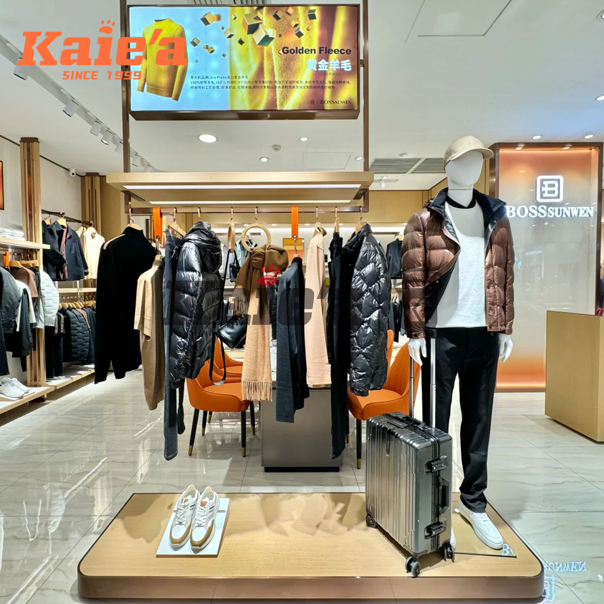 Tailored Fixtures: From wall-mounted racks to central islands, designed to fit men’s apparel styles.