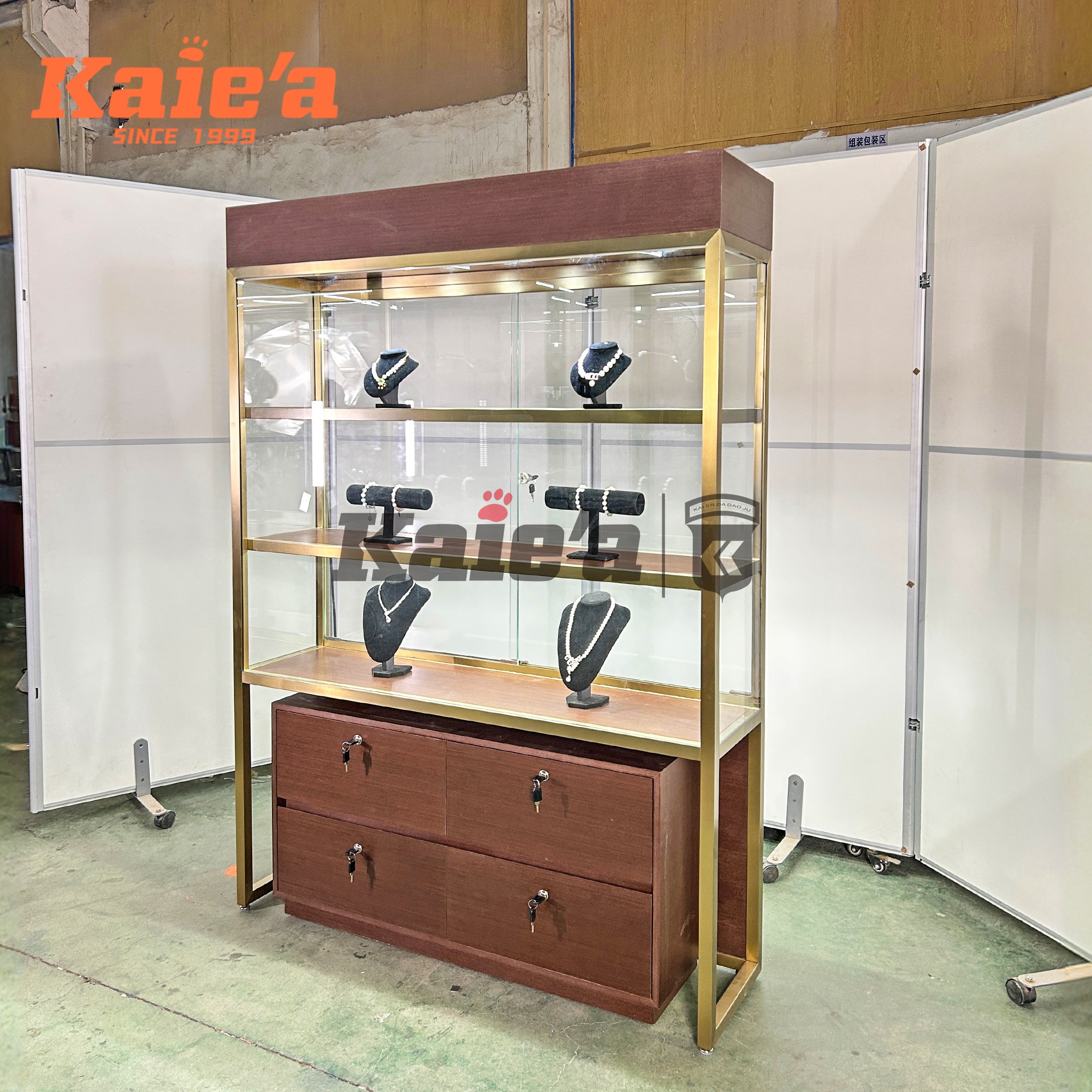 Product Name: Luxury Glass Jewelry Display Cabinet Size: (Customizable) Material: Tempered Glass + Stainless Steel Color: Matte Black / Champagne Gold / Custom Lighting: Integrated LED Strip (6000K, CRI>90) Glass Type: Ultra-clear tempered glass Storage: 2 lockable drawers + hidden wheels Lock Type: Concealed push-lock Power Input: 110V/220V, 50Hz Usage: Jewelry stores, exhibitions, boutiques OEM/ODM: Supported Lead Time: 25-30 days