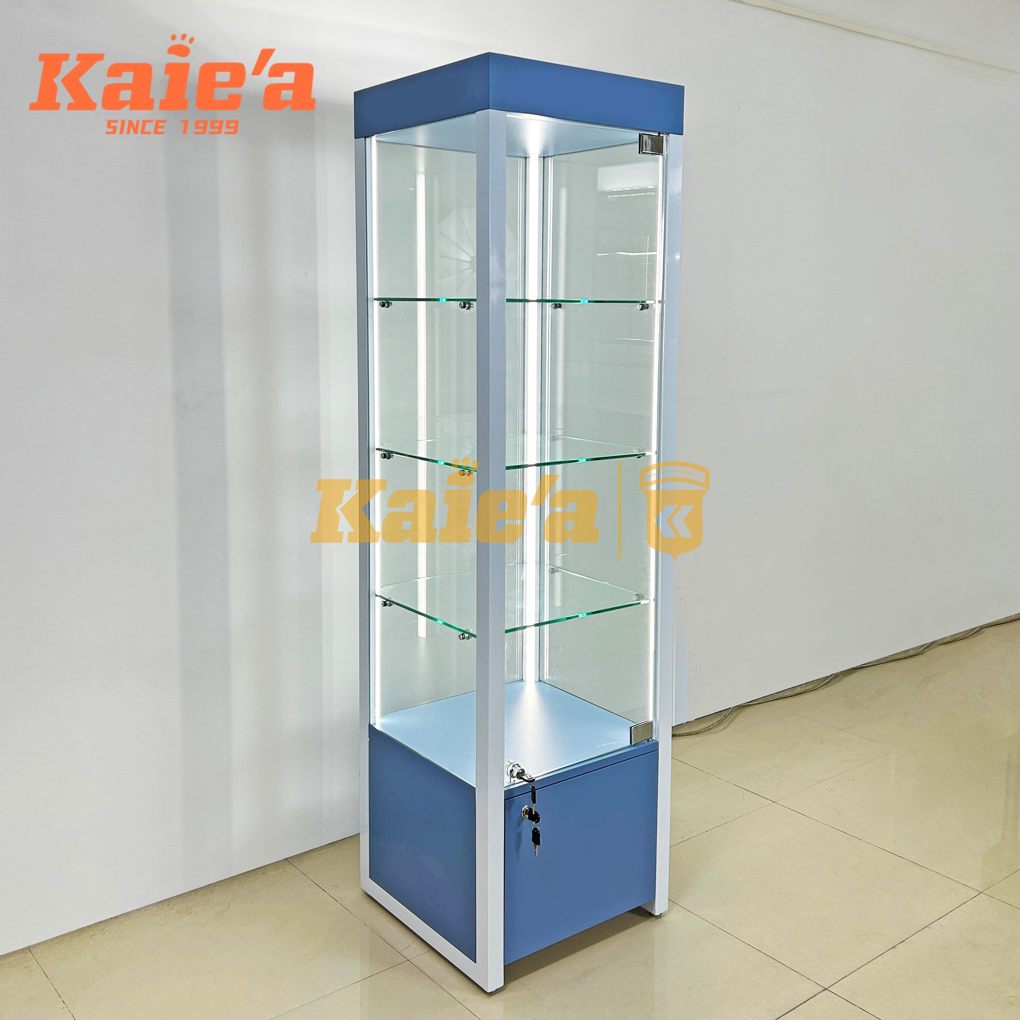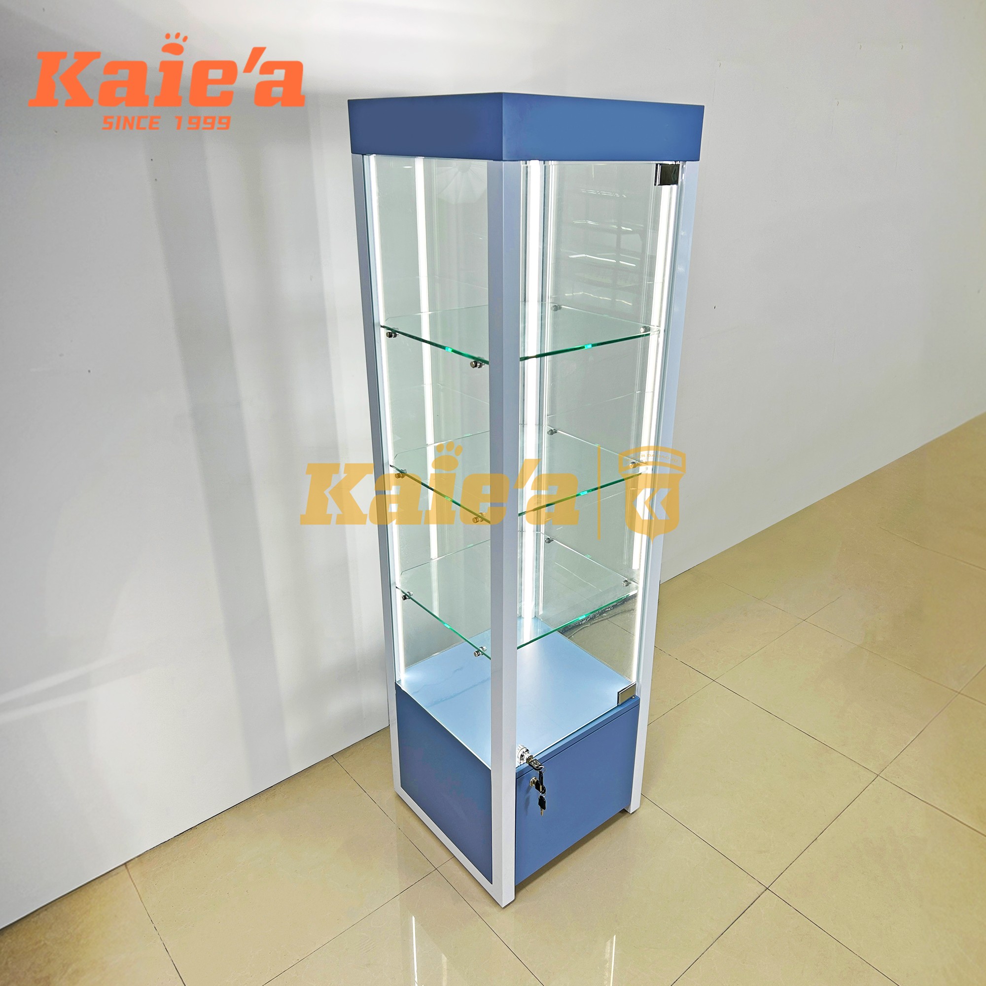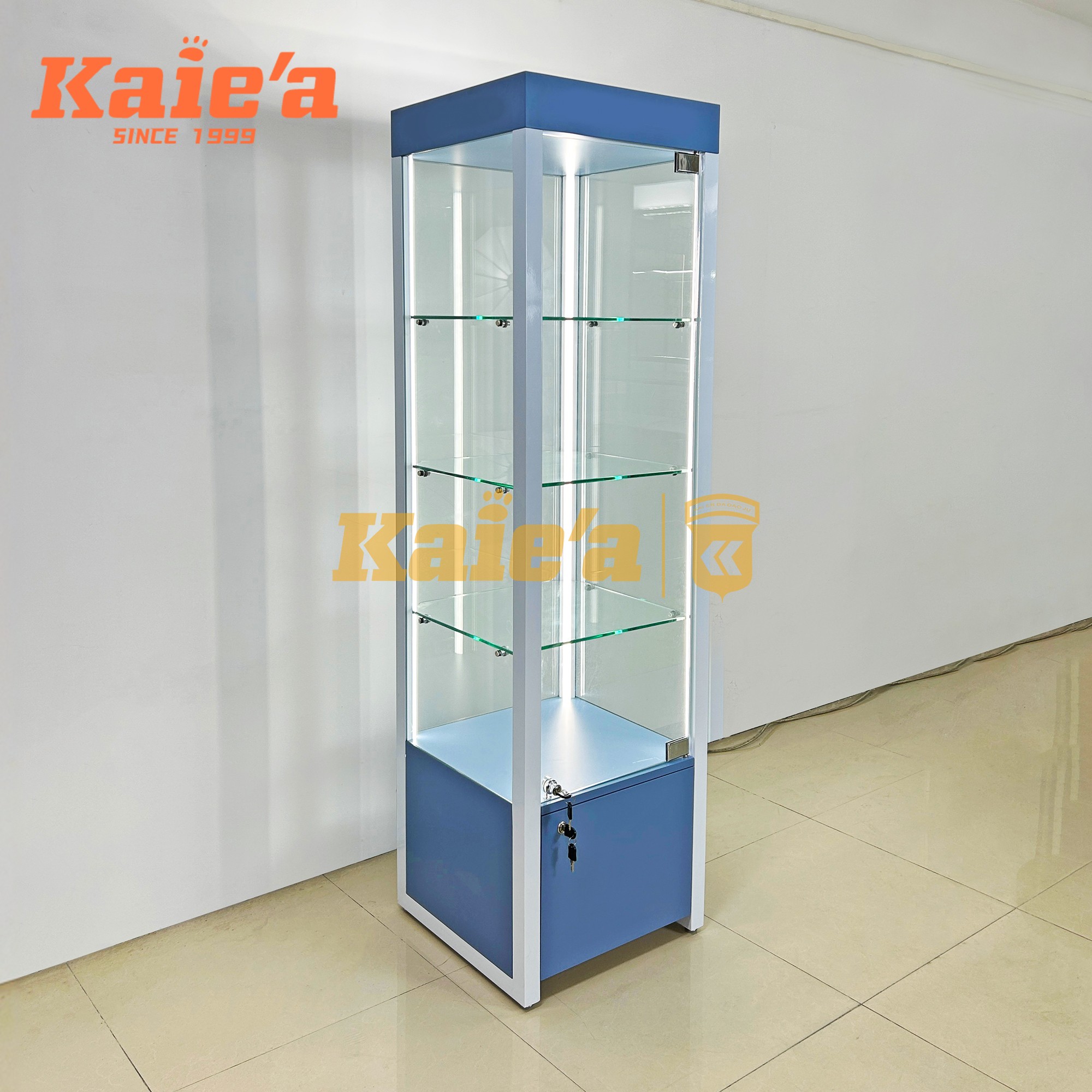 Product Name: Luxury Glass Jewelry Display Cabinet Size: (Customizable) Material: Tempered Glass + Stainless Steel Color: Matte Black / Champagne Gold / Custom Lighting: Integrated LED Strip (6000K, CRI>90) Glass Type: Ultra-clear tempered glass Storage: 2 lockable drawers + hidden wheels Lock Type: Concealed push-lock Power Input: 110V/220V, 50Hz Usage: Jewelry stores, exhibitions, boutiques OEM/ODM: Supported Lead Time: 25-30 days
