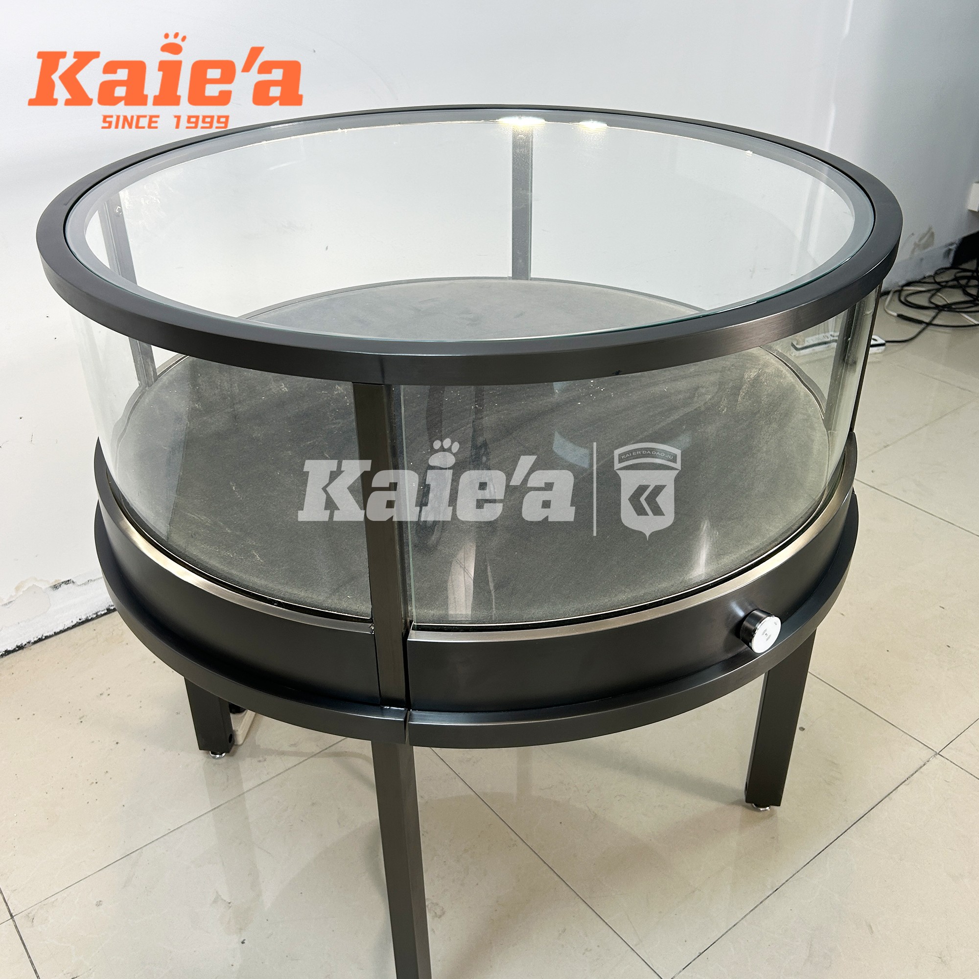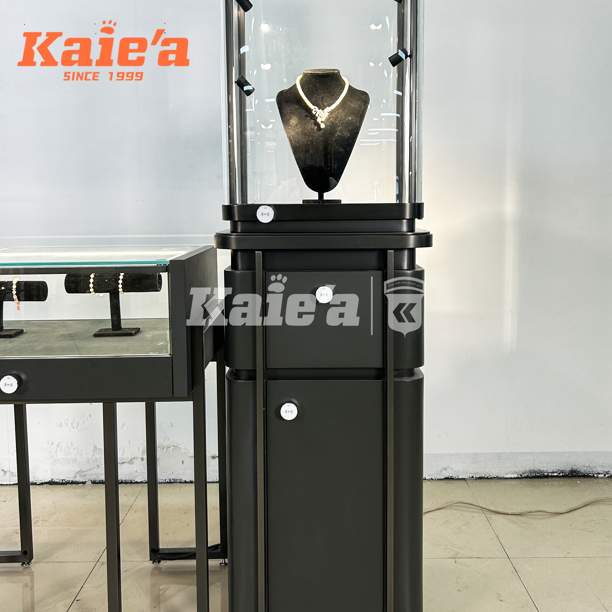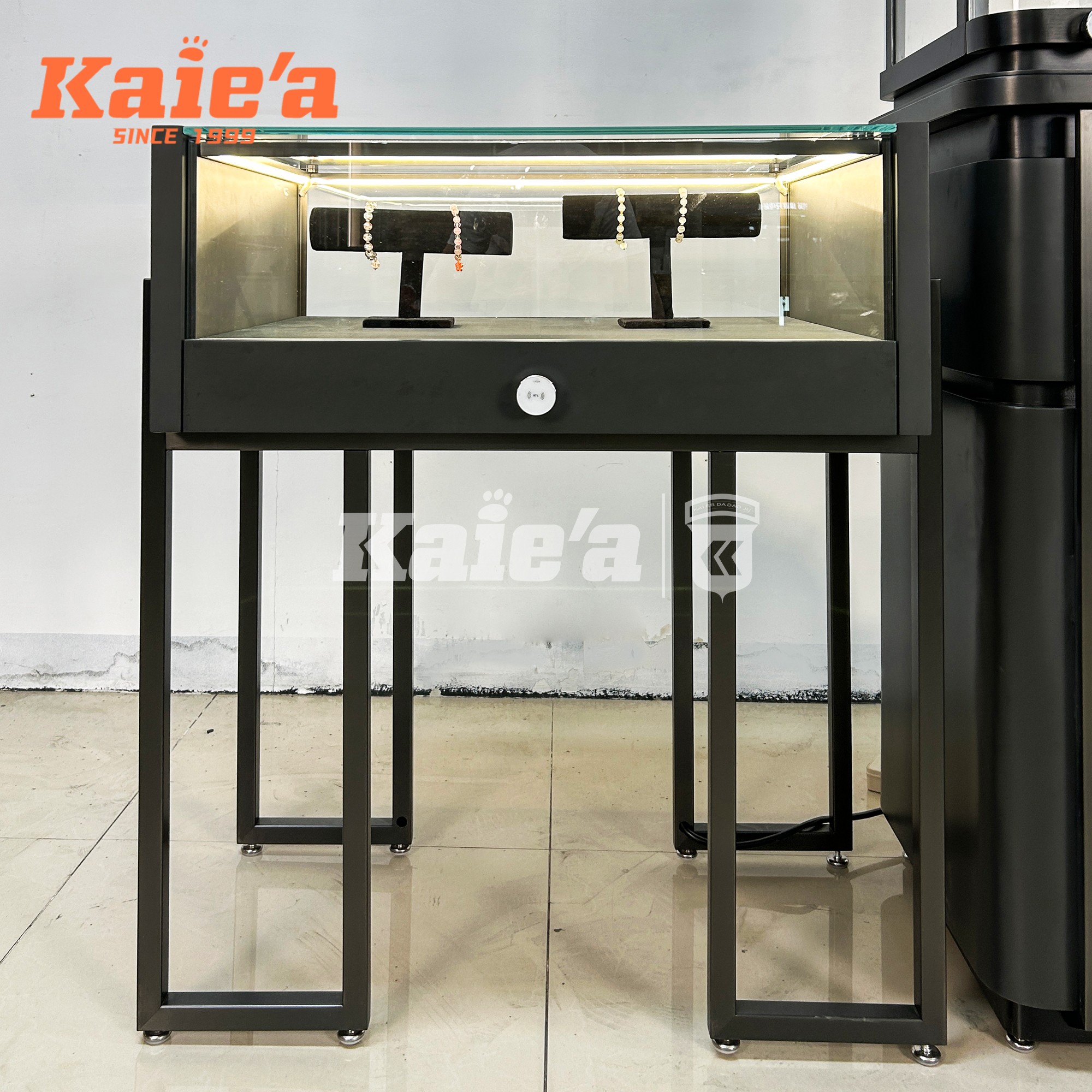 Product Name: Luxury Glass Jewelry Display Cabinet Size: (Customizable) Material: Tempered Glass + Stainless Steel Color: Matte Black / Champagne Gold / Custom Lighting: Integrated LED Strip (6000K, CRI>90) Glass Type: Ultra-clear tempered glass Storage: 2 lockable drawers + hidden wheels Lock Type: Concealed push-lock Power Input: 110V/220V, 50Hz Usage: Jewelry stores, exhibitions, boutiques OEM/ODM: Supported Lead Time: 25-30 days