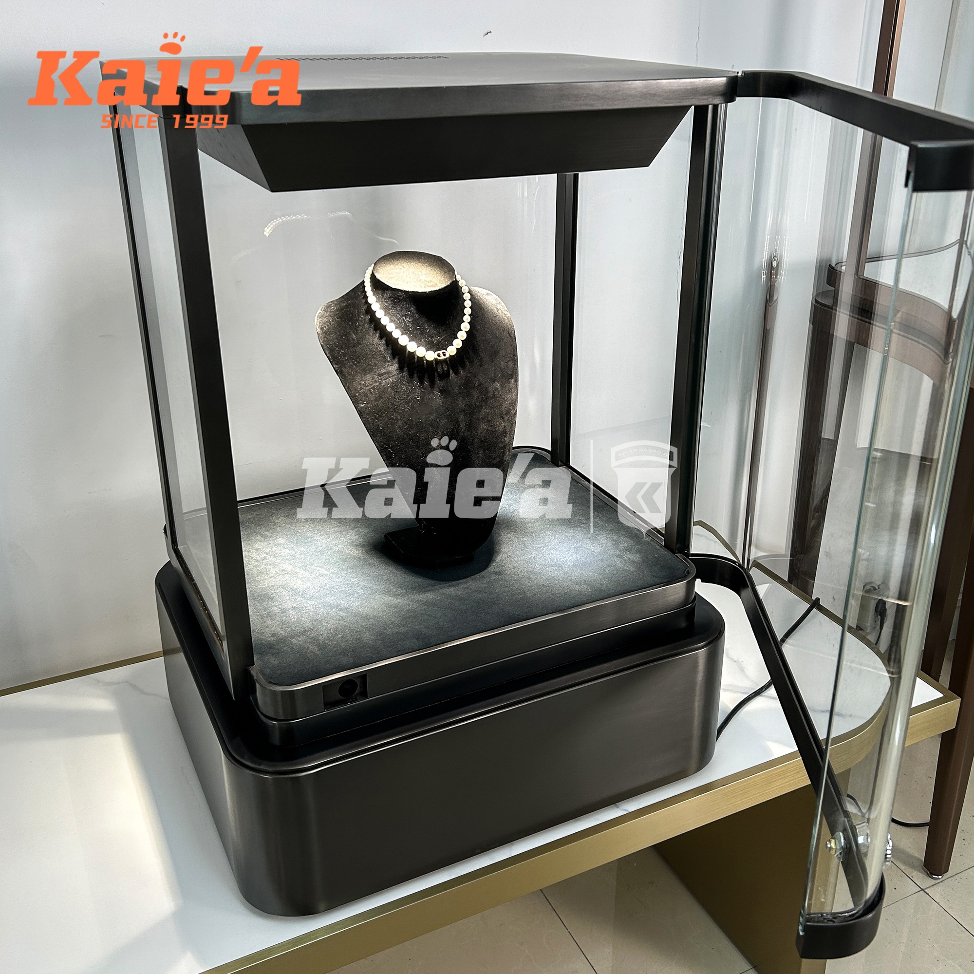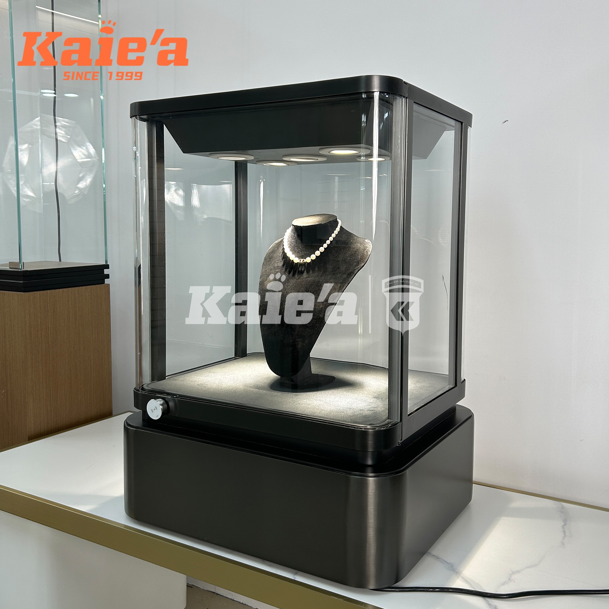 Product Name: Luxury Glass Jewelry Display Cabinet Size: (Customizable) Material: Tempered Glass + Stainless Steel Color: Matte Black / Champagne Gold / Custom Lighting: Integrated LED Strip (6000K, CRI>90) Glass Type: Ultra-clear tempered glass Storage: 2 lockable drawers + hidden wheels Lock Type: Concealed push-lock Power Input: 110V/220V, 50Hz Usage: Jewelry stores, exhibitions, boutiques OEM/ODM: Supported Lead Time: 25-30 days