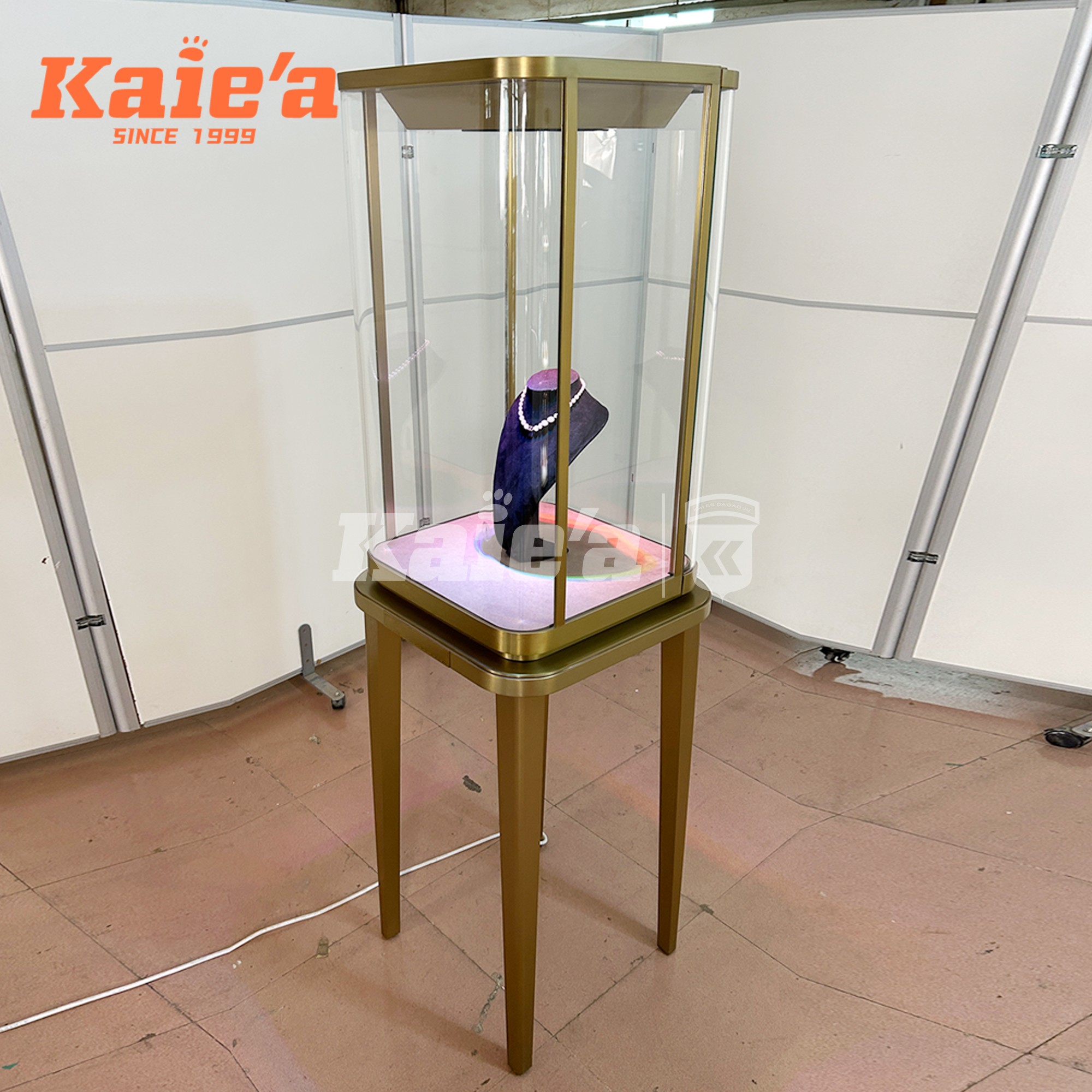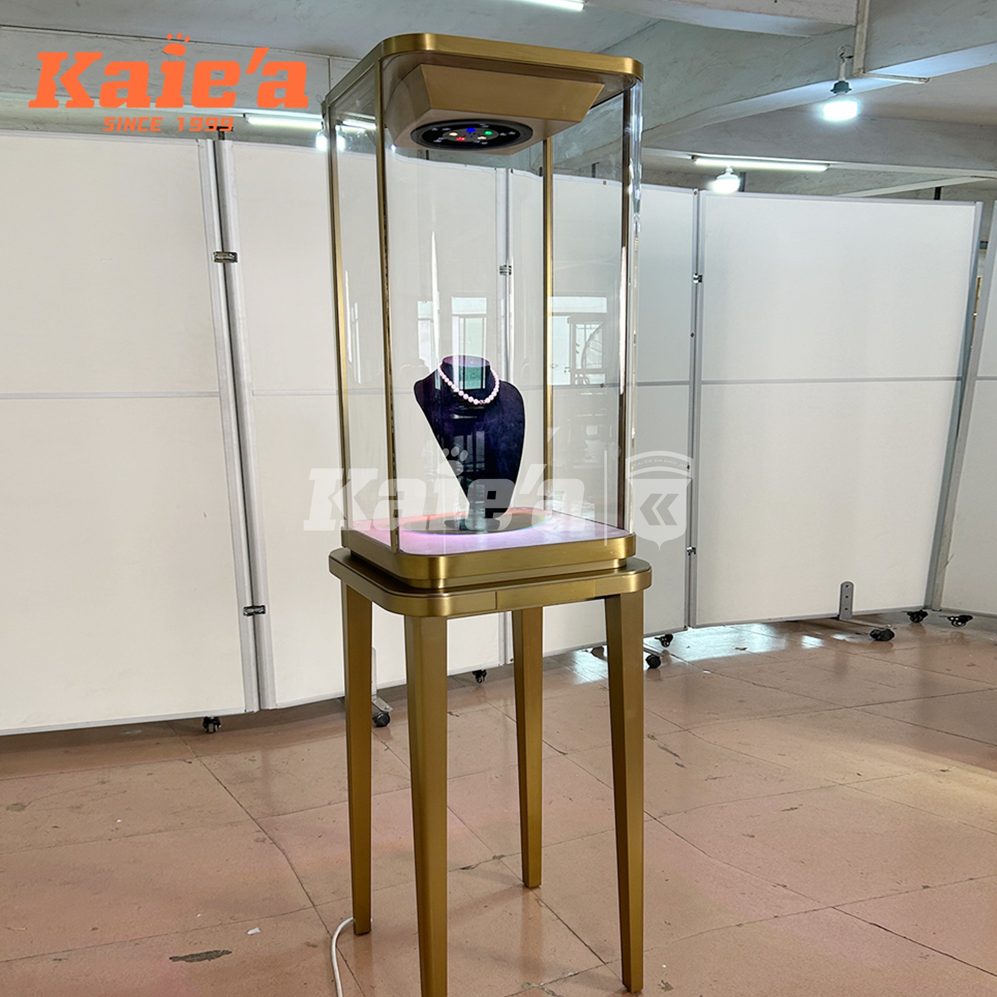 Product Name: Luxury Glass Jewelry Display Cabinet Size: (Customizable) Material: Tempered Glass + Stainless Steel Color: Matte Black / Champagne Gold / Custom Lighting: Integrated LED Strip (6000K, CRI>90) Glass Type: Ultra-clear tempered glass Storage: 2 lockable drawers + hidden wheels Lock Type: Concealed push-lock Power Input: 110V/220V, 50Hz Usage: Jewelry stores, exhibitions, boutiques OEM/ODM: Supported Lead Time: 25-30 days