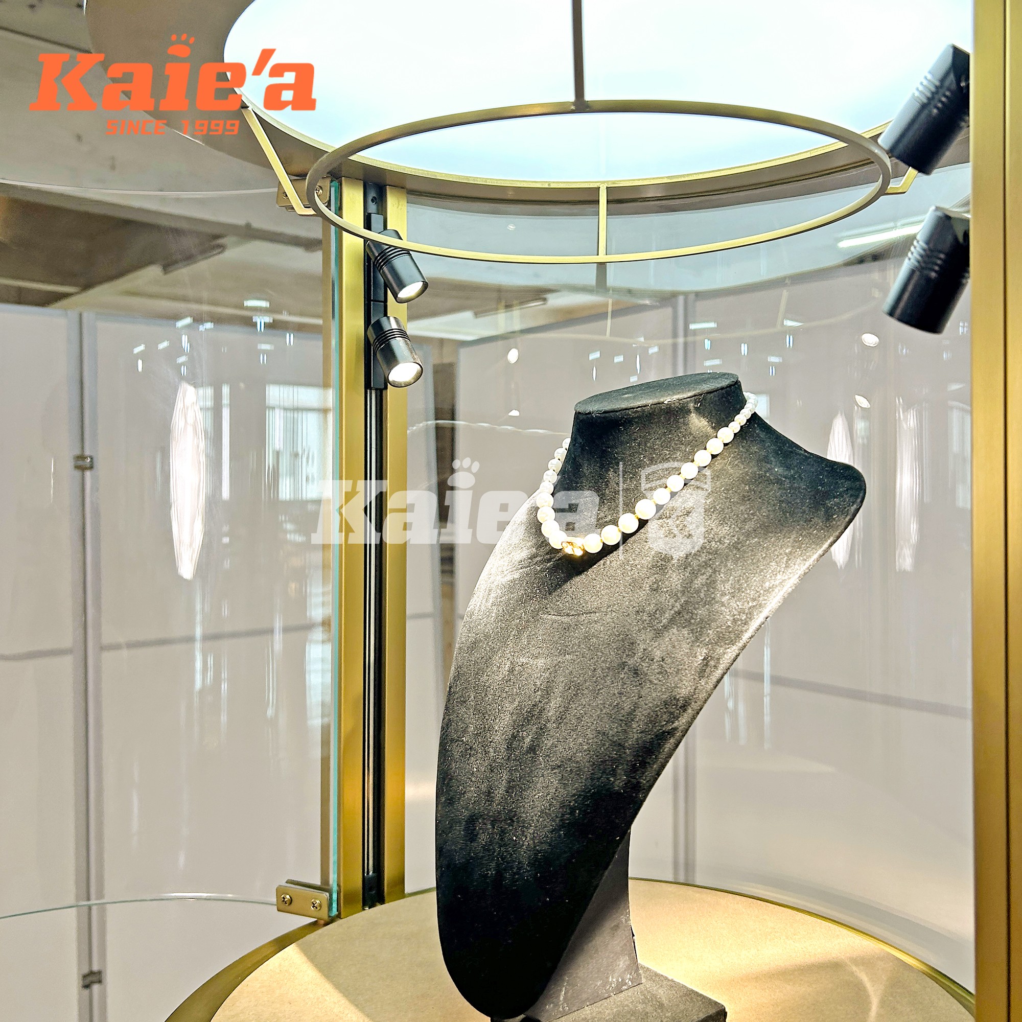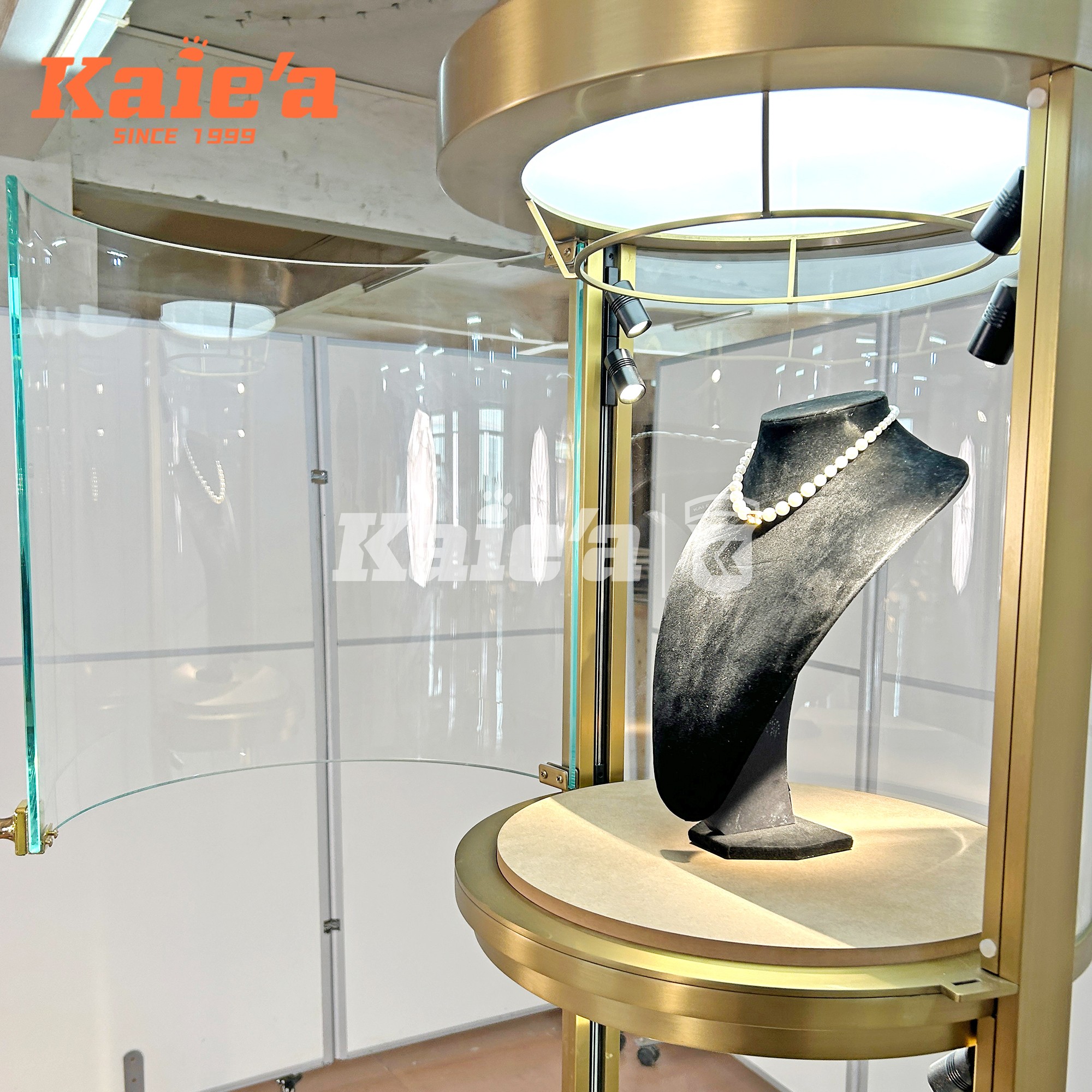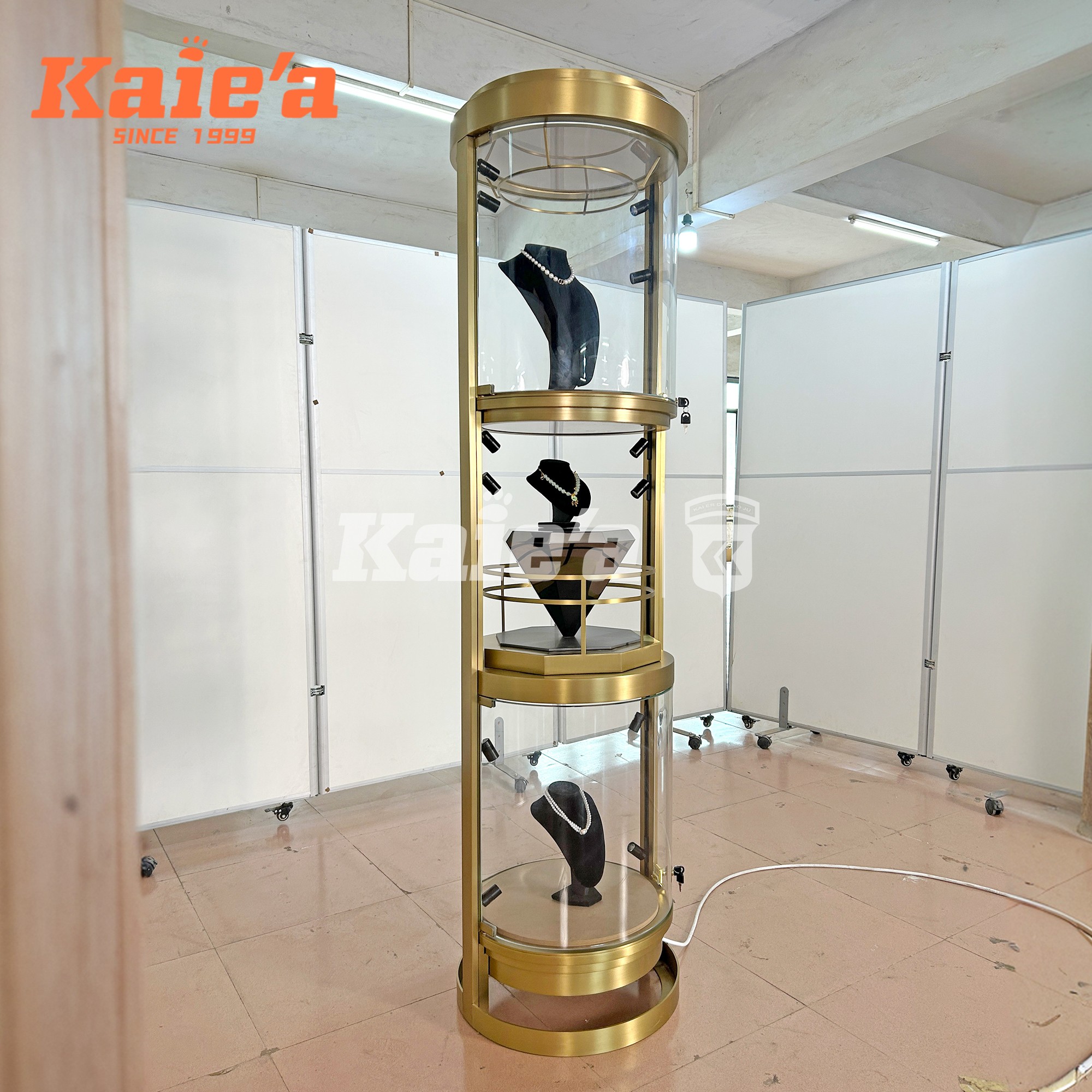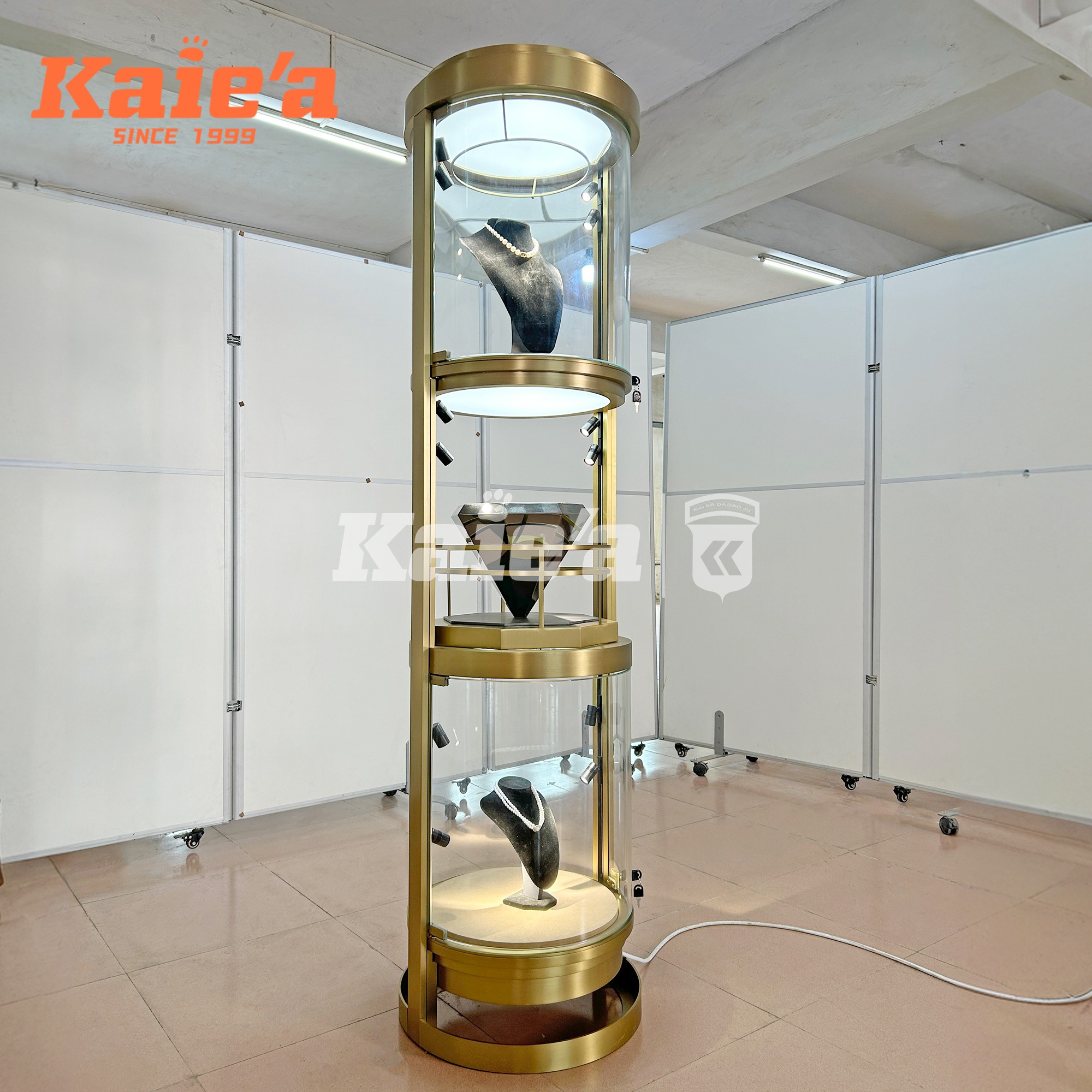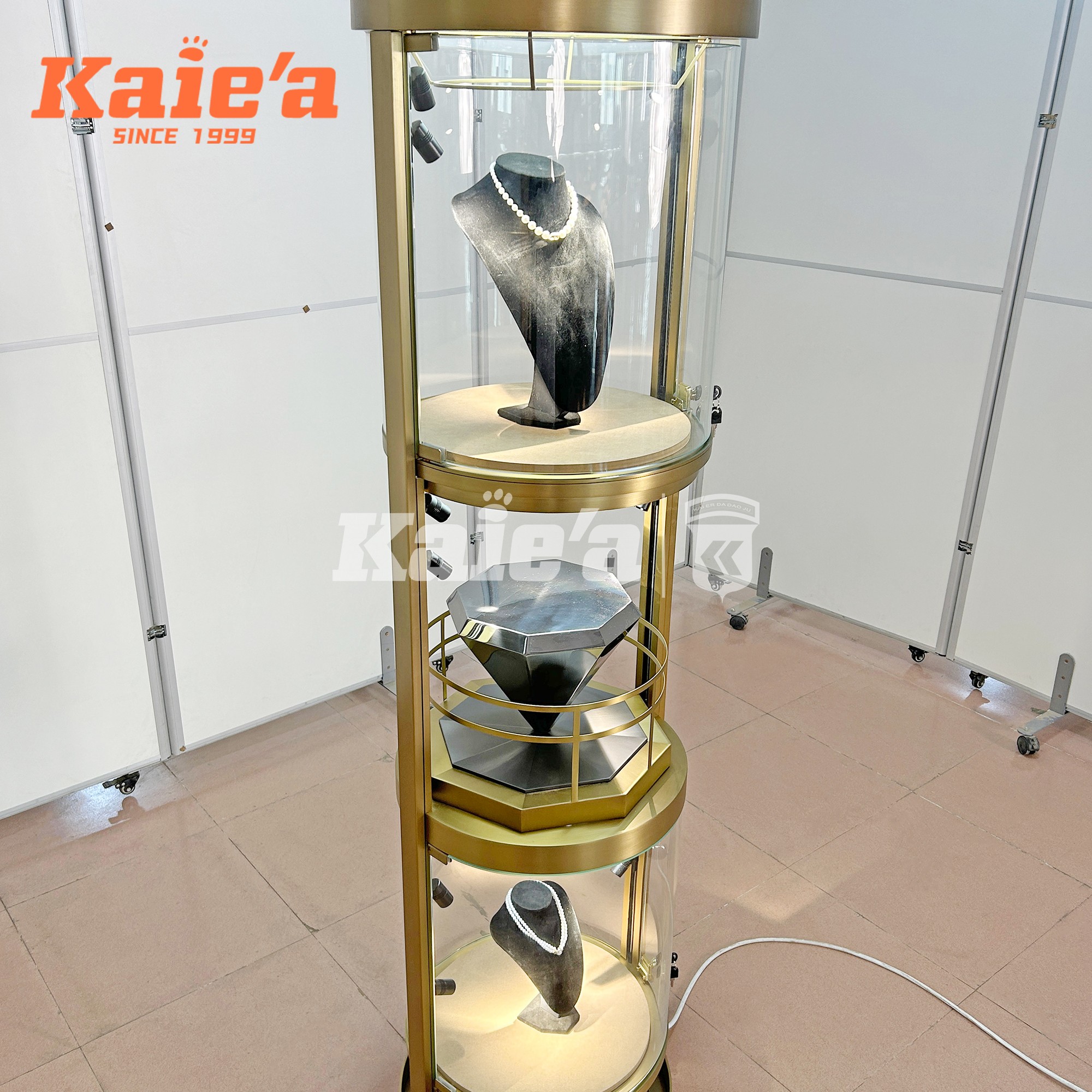 Integrated soft-glow LED lighting ensures each tier is evenly illuminated, enhancing the brilliance and detail of every piece. The minimalist frame, combined with a weighted base and discreet security locks, makes this cabinet a perfect addition to luxury boutiques, mall showcases, and designer brand showrooms.