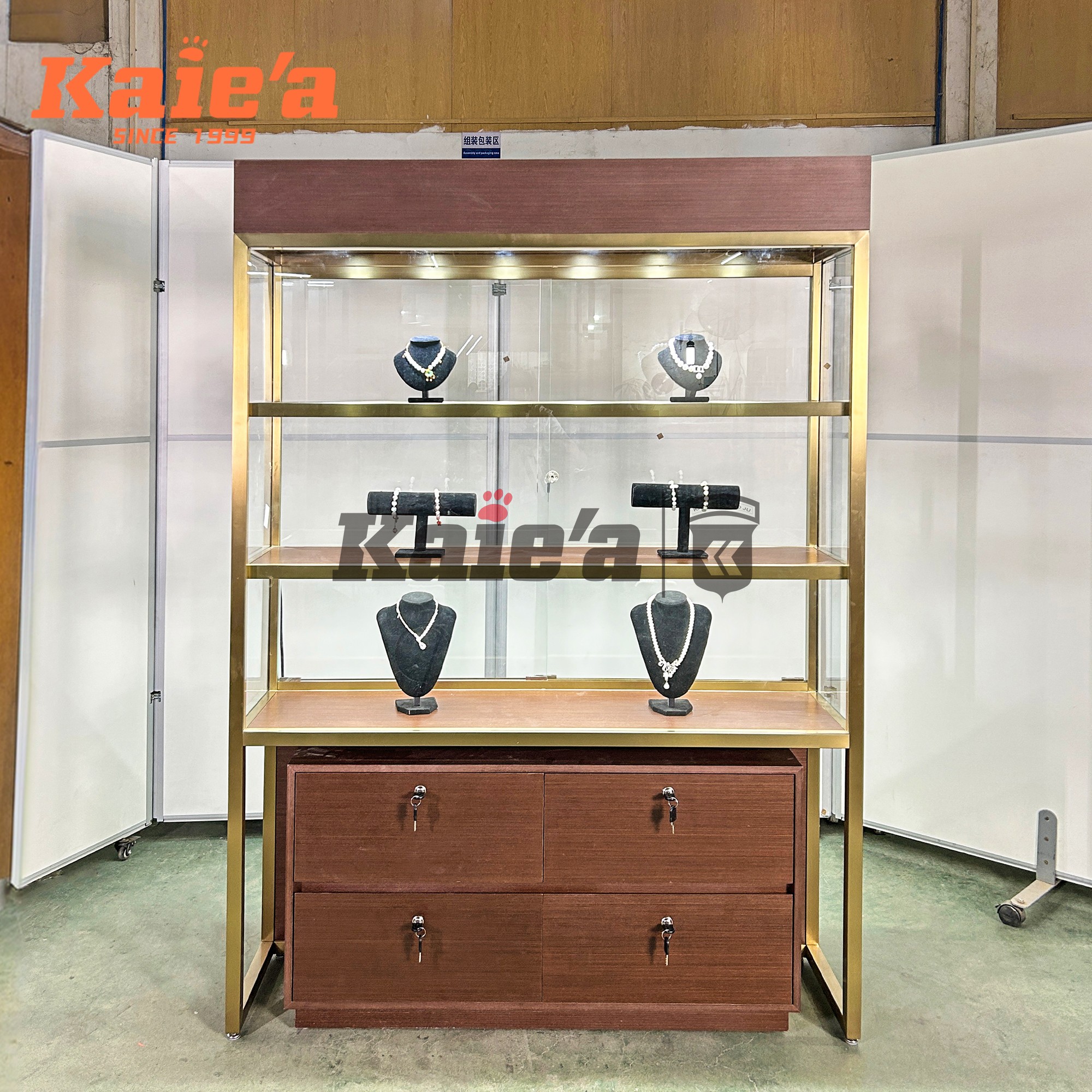 Product Name: Luxury Glass Jewelry Display Cabinet Size: (Customizable) Material: Tempered Glass + Stainless Steel Color: Matte Black / Champagne Gold / Custom Lighting: Integrated LED Strip (6000K, CRI>90) Glass Type: Ultra-clear tempered glass Storage: 2 lockable drawers + hidden wheels Lock Type: Concealed push-lock Power Input: 110V/220V, 50Hz Usage: Jewelry stores, exhibitions, boutiques OEM/ODM: Supported Lead Time: 25-30 days